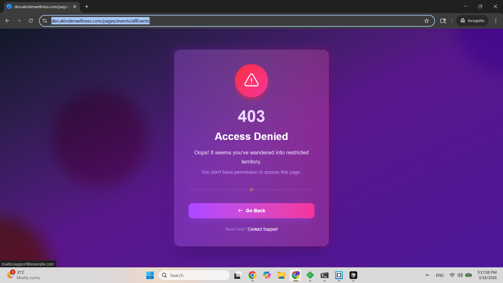 https://dev.akinderwellness.com/pages/events/allEvents - Observe the Access Denied page