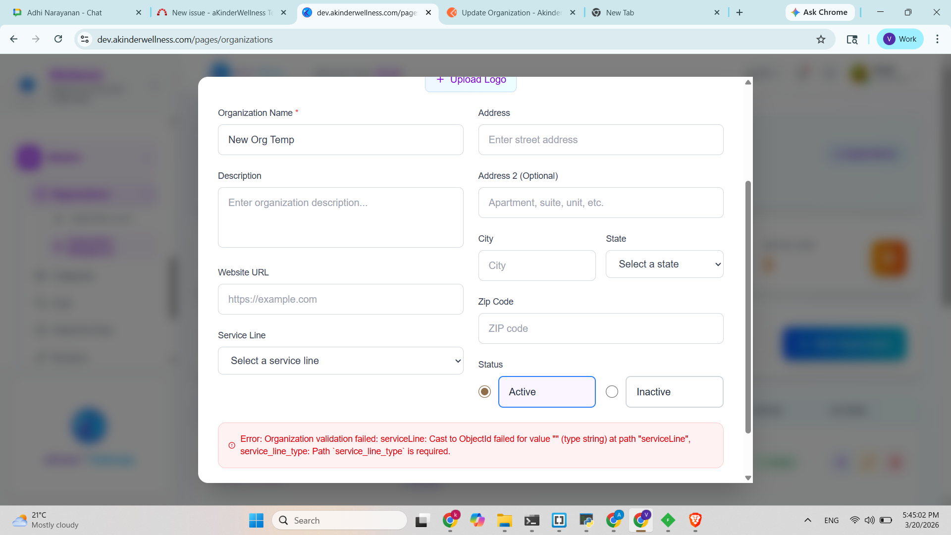 User sees raw backend error: Organization validation failed: serviceLine: Cast to ObjectId failed for value "" (type string) at path "serviceLine", service_line_type: Path service_line_type is required.