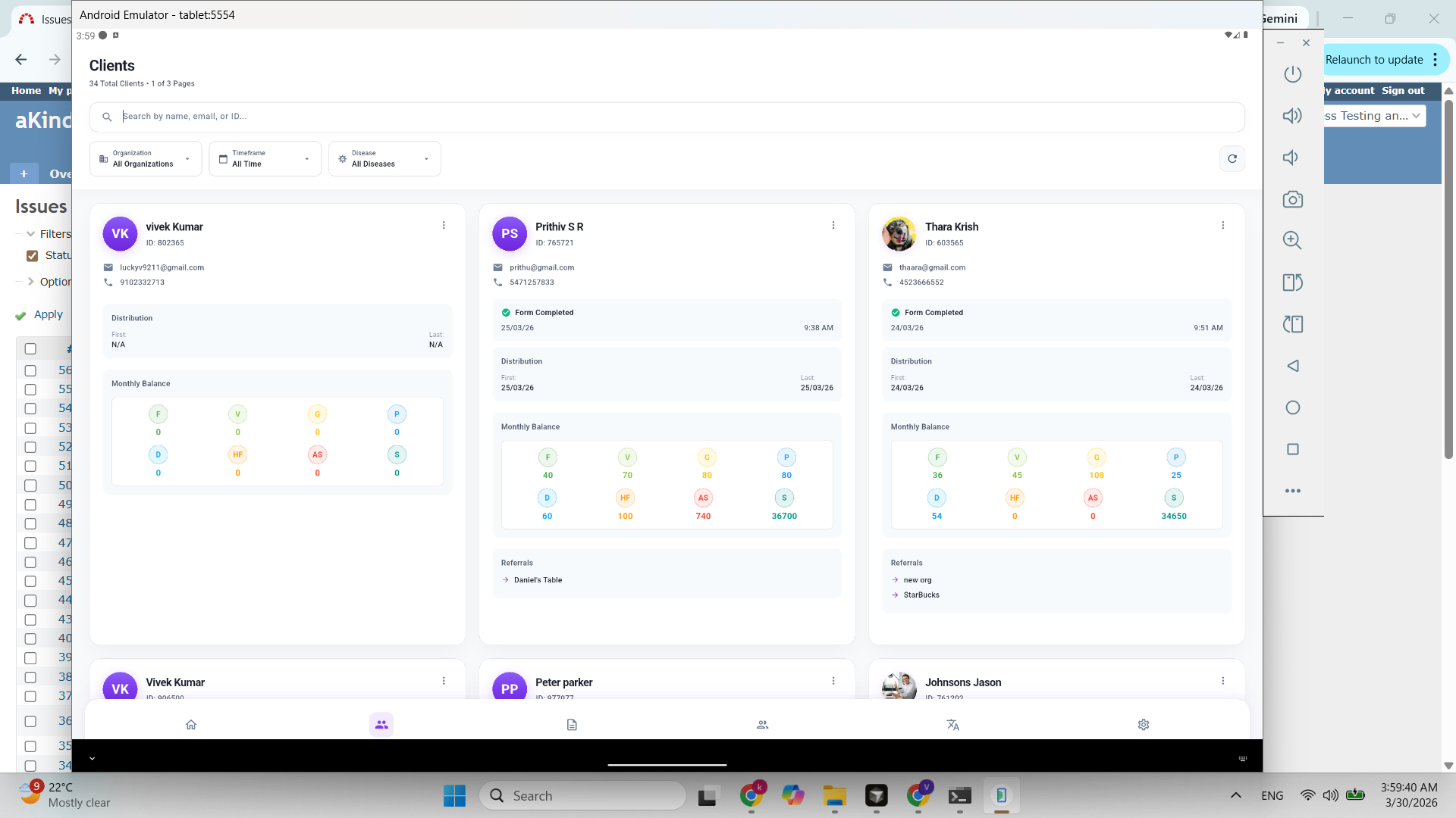 The search field indicates that users can search for clients using name, email, or ID. However, when entering a valid client ID, no results are returned, even though the client exists in the system.