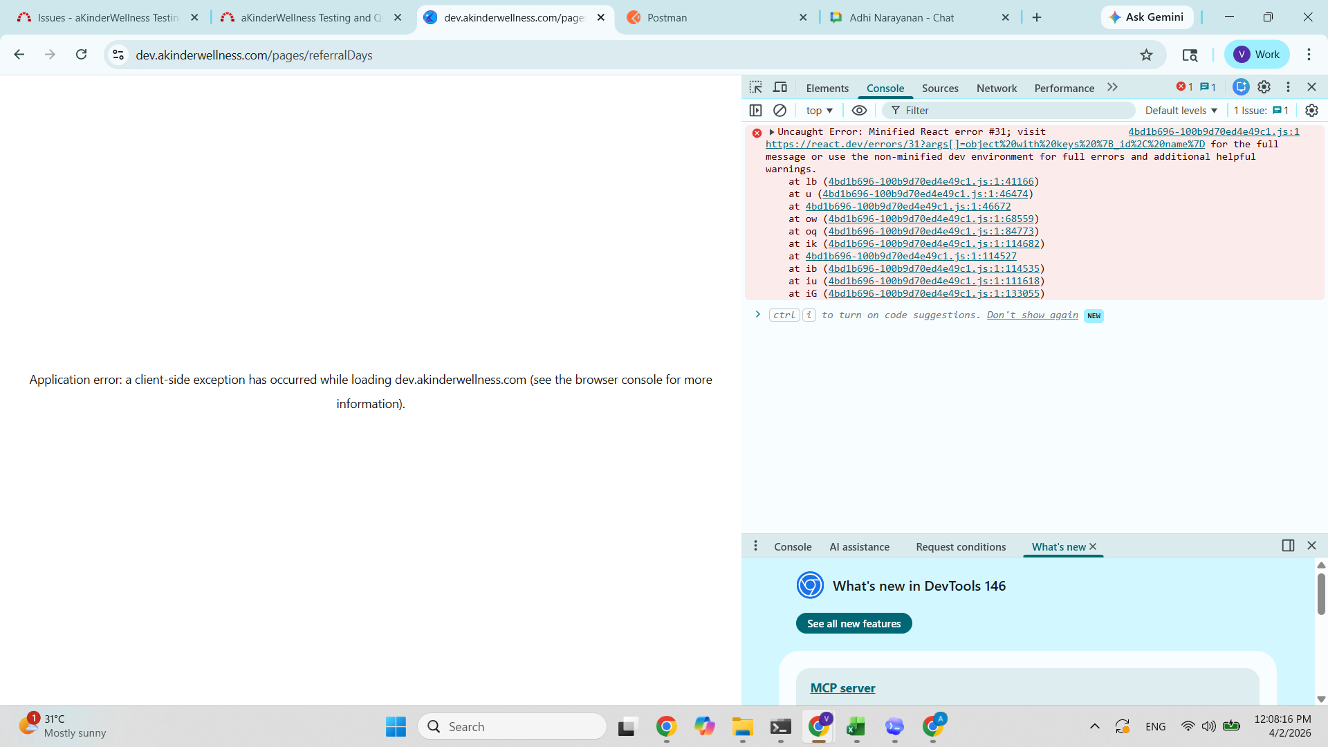 Console shows:Uncaught Error: Minified React error #31